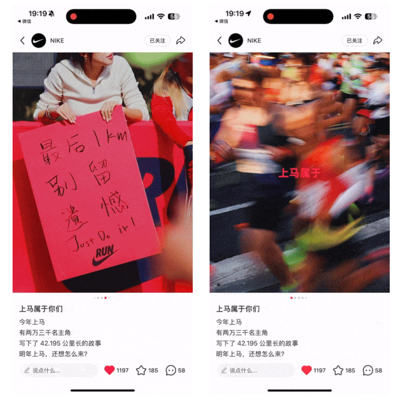 上马当晚,Nike 发布了以“两万三千名跑者”为主角的 Social Post,为 2025 上马完美收官,也为下一场#马拉松备赛试炼 吹响集合号。