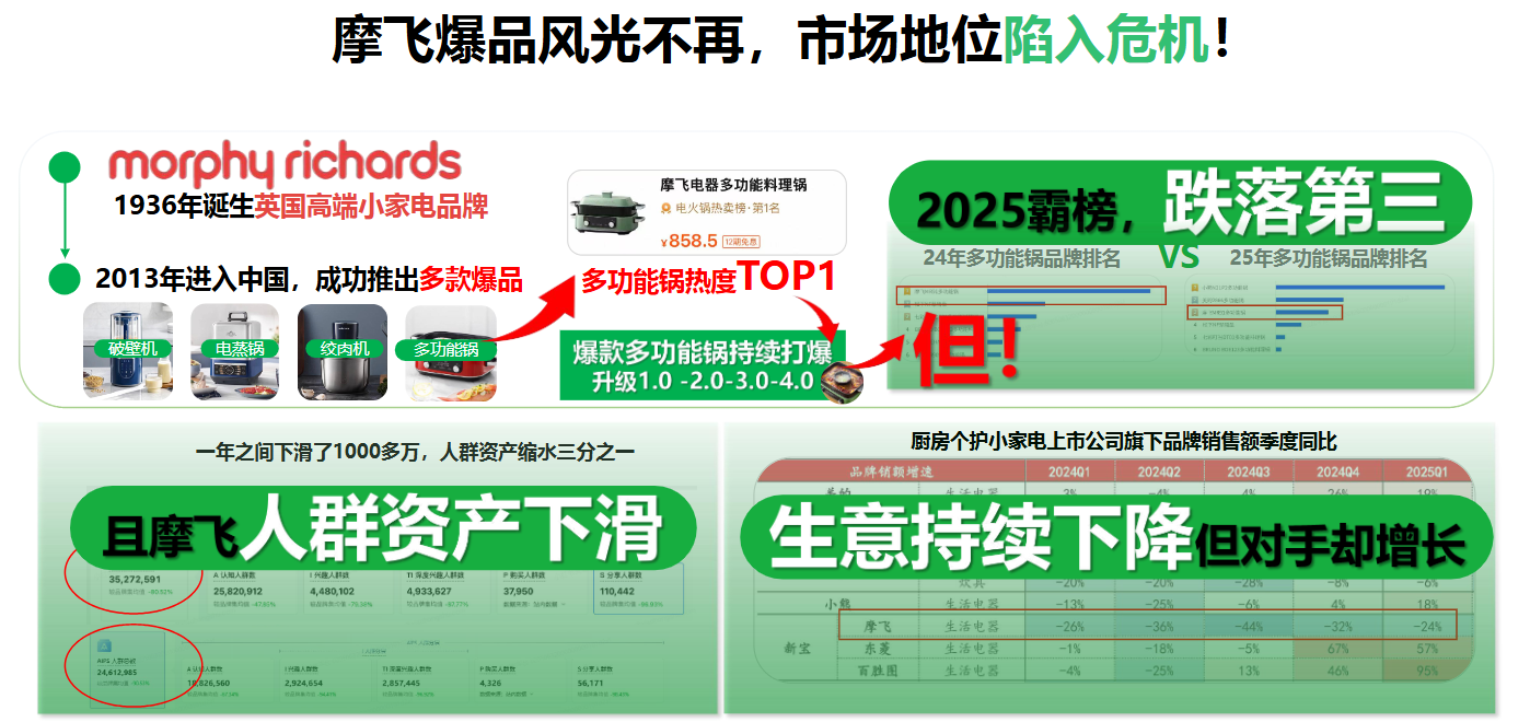 然而2025年品牌面临严重增长危机:曾经霸帮TOP1的多功能锅排名从榜首跌落至第三,人群资产缩水约三分之一,年销售额持续下滑但对手却在增长。