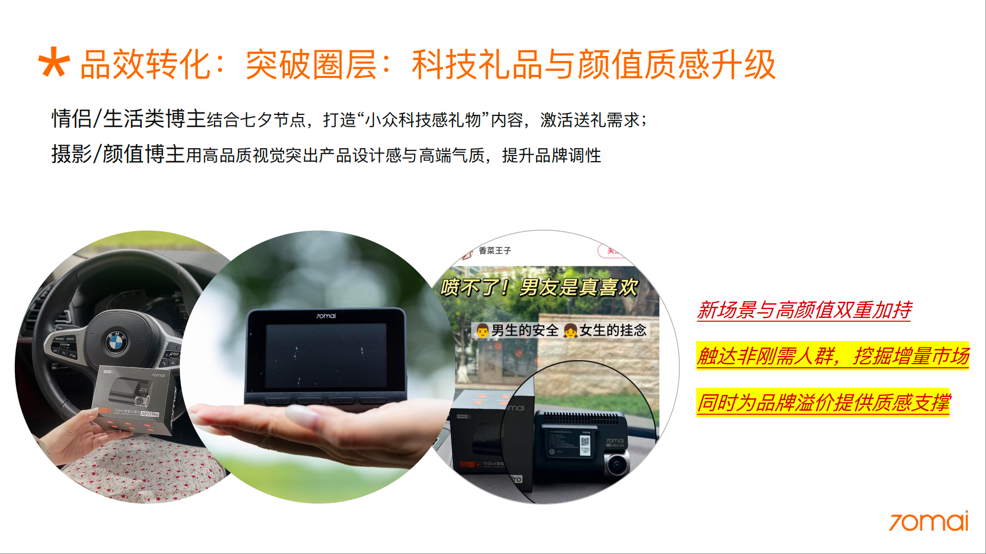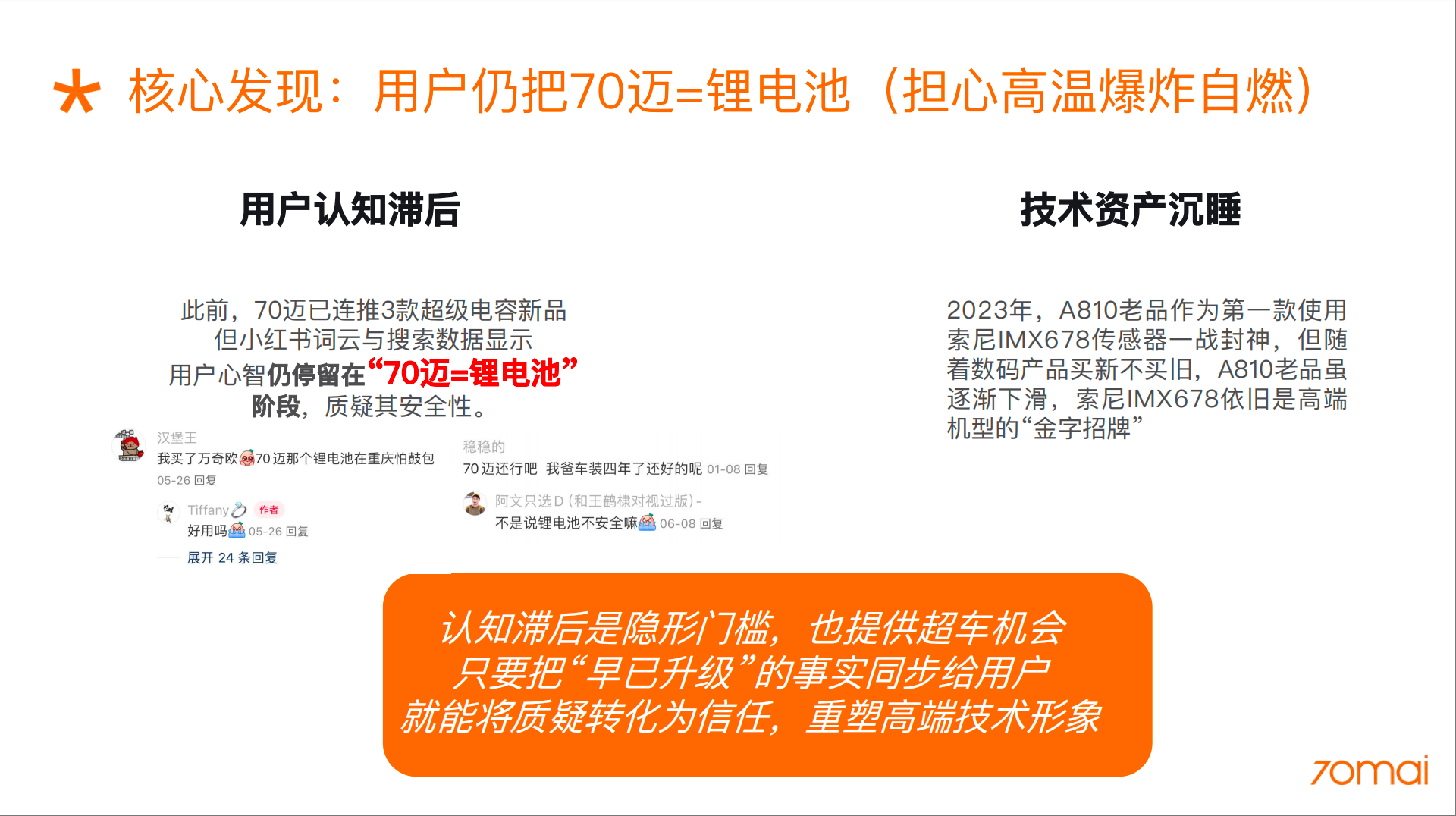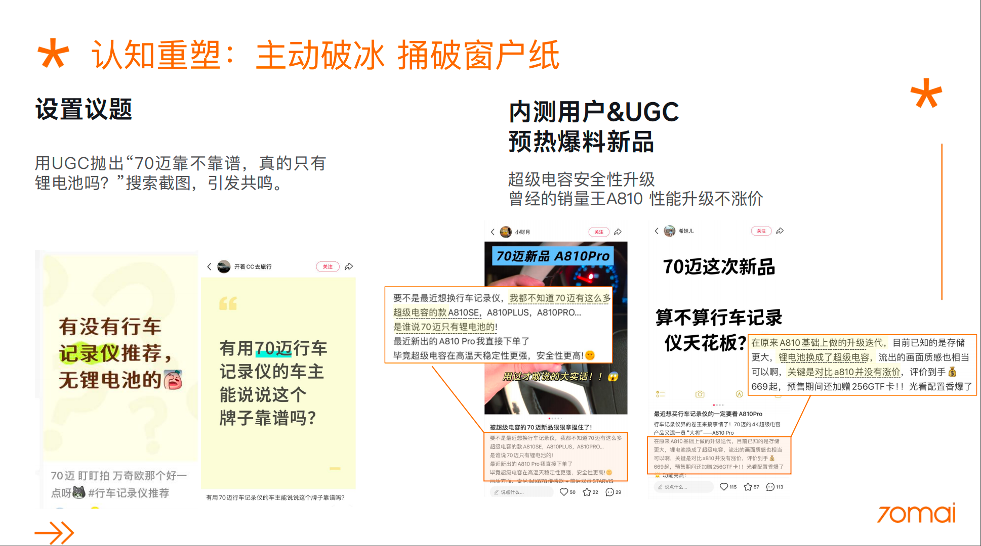1. 认知重塑目标:扭转用户对70迈“仅使用锂电池”的刻板印象,建立“70迈=超级电容安全技术”的新认知。