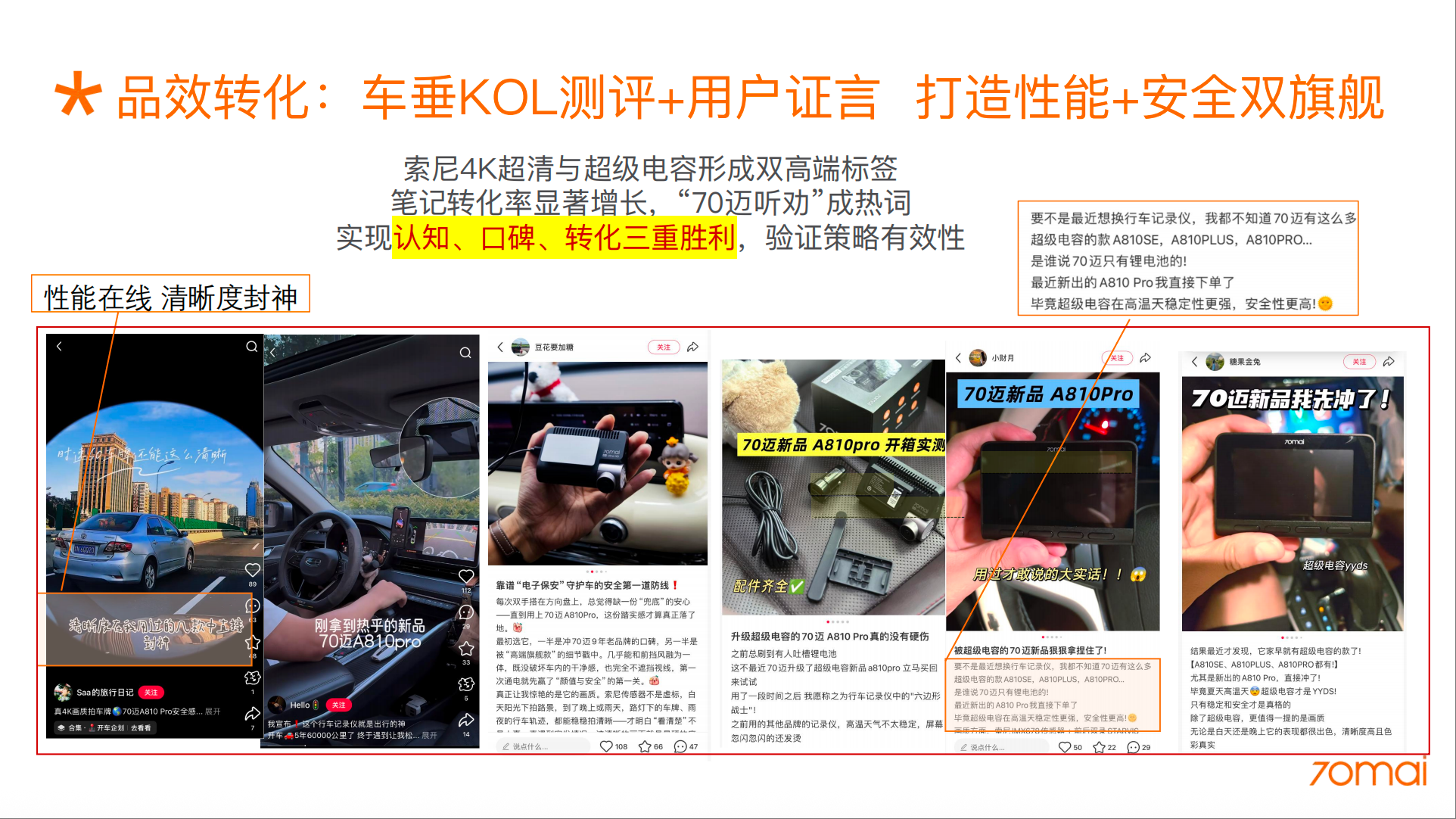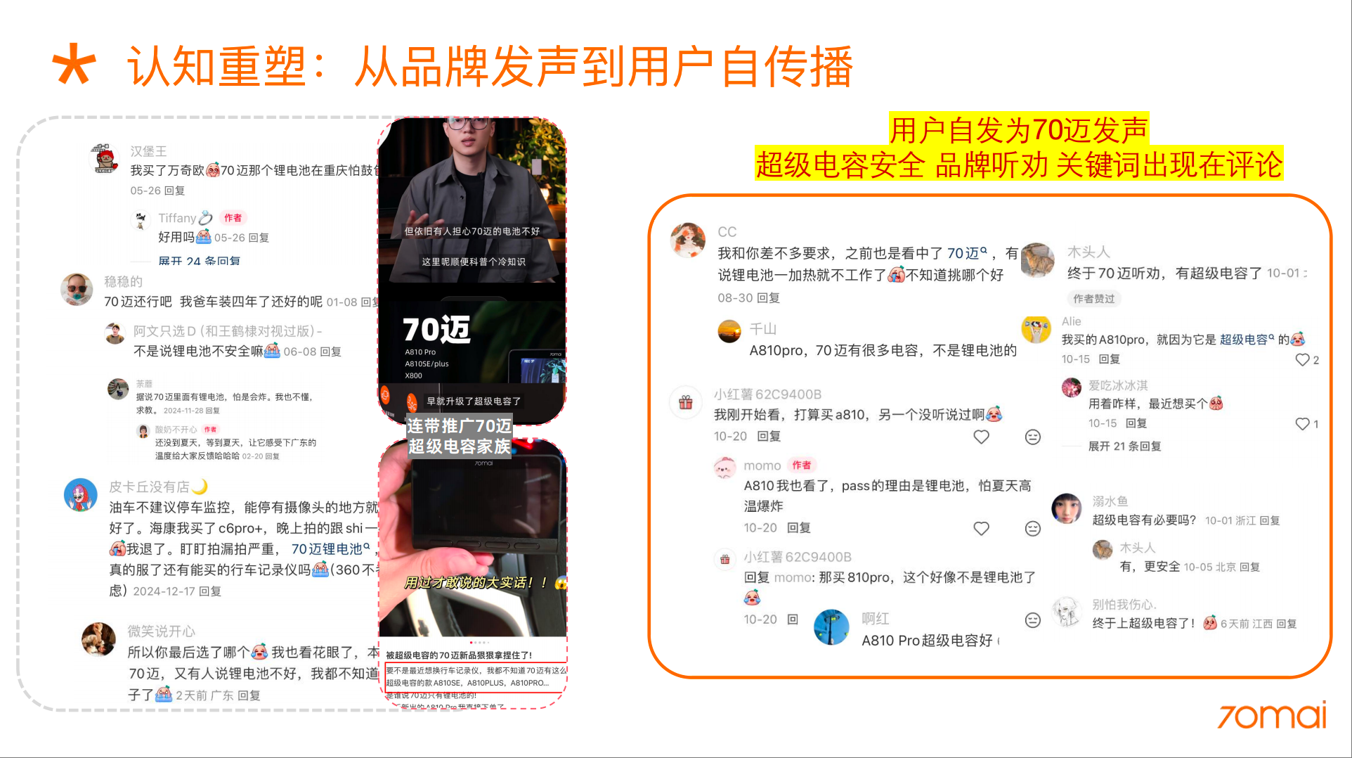 主动承认用户对锂电池的担忧,借助老用户证言与行业测评,传递“70迈早已布局超级电容产品线”的事实,打破信息壁垒