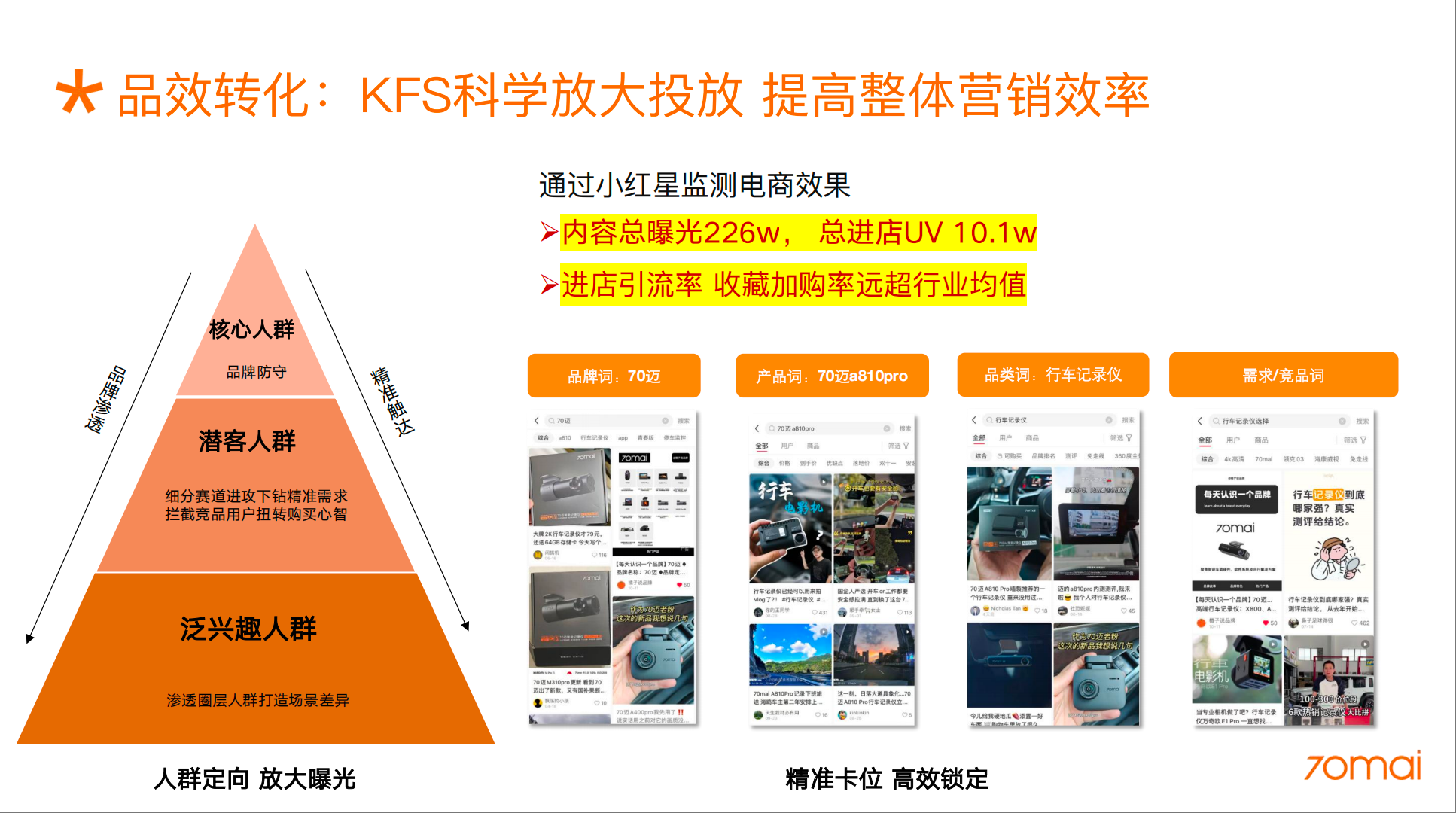 2. 品效协同目标: - 小红书平台用户搜索热度、小红星引流进店率&进店成本、电商搜索词提升&A810Pro销售增长