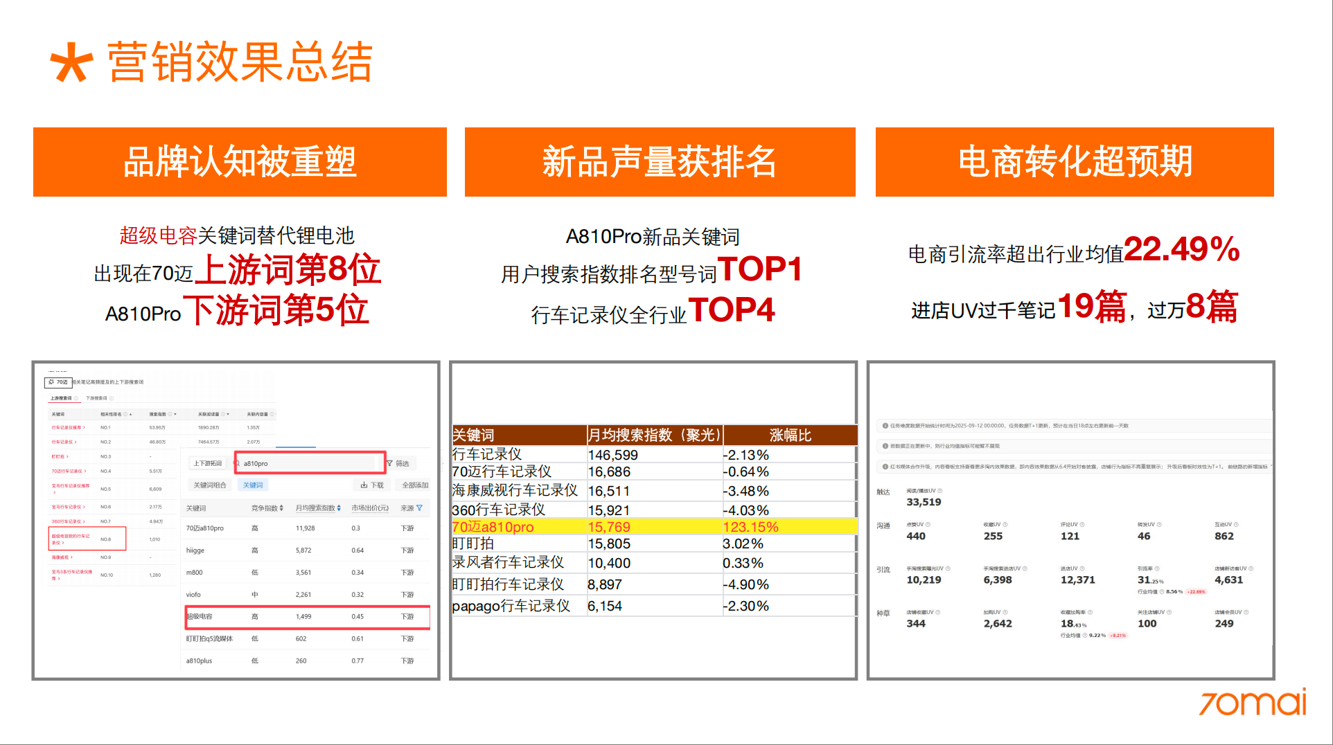 电商引流率超出行业均值22.49%,进店UV过千笔记19篇,过万8篇,最终A810Pro电商销售额远超出内部预期,实现品效合一