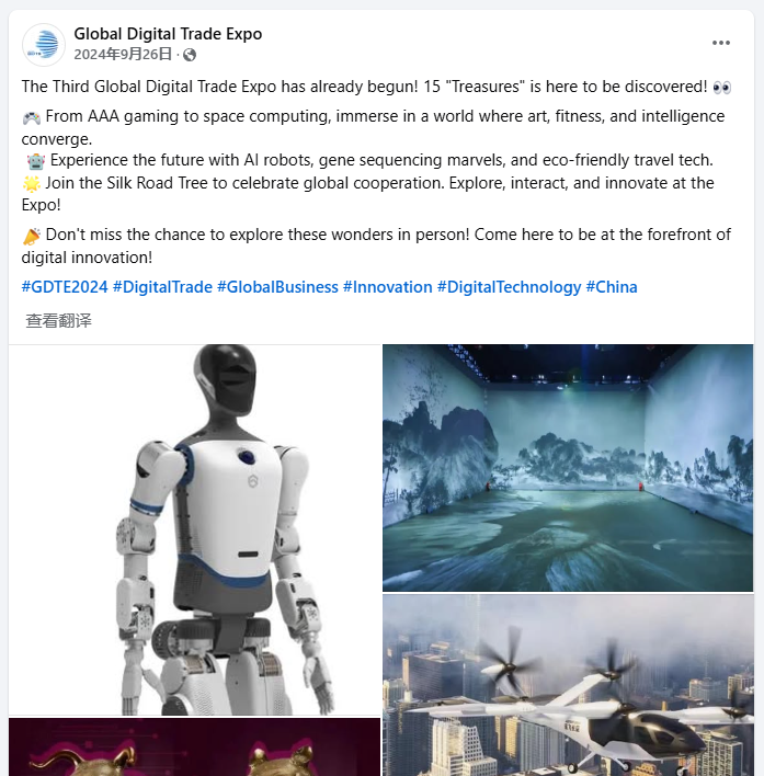 ②传播信息设计与内容创意:通过“视觉+语词”双重维度构建传播信息体系。构建统一视觉识别系统,进行全网平台的VI设计与优化。将所有海外传播渠道官方账号统一更名为“Global Digital Trade Expo”,突出“数贸会”的国际化与科技感形象。以“数字贸易 商通全球”为核心主张,结合《黑神话:悟空》IP中的东方叙事,将中国文化符号与科技感结合,向世界传递“中国CES”的独特魅力。