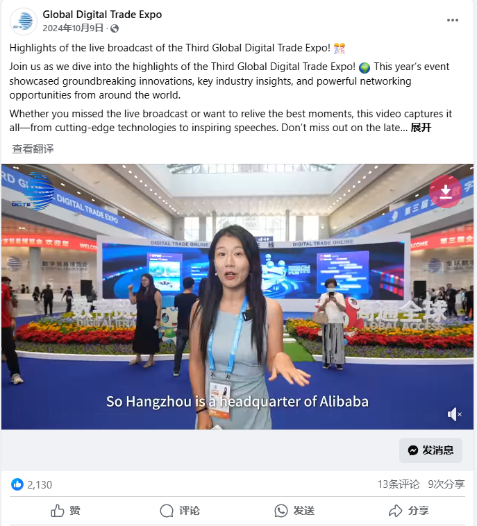 全球数字贸易博览会Global Digital Trade Expo(简称数贸会)是中国唯一以数字贸易为核心的国家级、国际性、专业型展会。作为数贸会官方唯一的海外数字营销合作伙伴,我们已经连续两届与数贸会携手合作。第三届数贸会在延续第二届高水准、高规格的基础上,通过Facebook首次全球化直播、精准广告投放、文化科技内容共创等创新手段,助力数贸会突破国际声量不足的困境,打造“Global Digital Trade Expo”品牌IP。其中,首次加入的Facebook全球直播(共两场)共获得了32万次观看量,直播间最高同时在线人数达到了1.08万人;针对展会发布的PR新闻稿覆盖了835家海外媒体,潜在触达4.84亿人次,被600家媒体转载,有效提升了数贸会的国际声量和品牌知名度,实现了从区域性展会向“国际数字贸易风向标”的跃升。