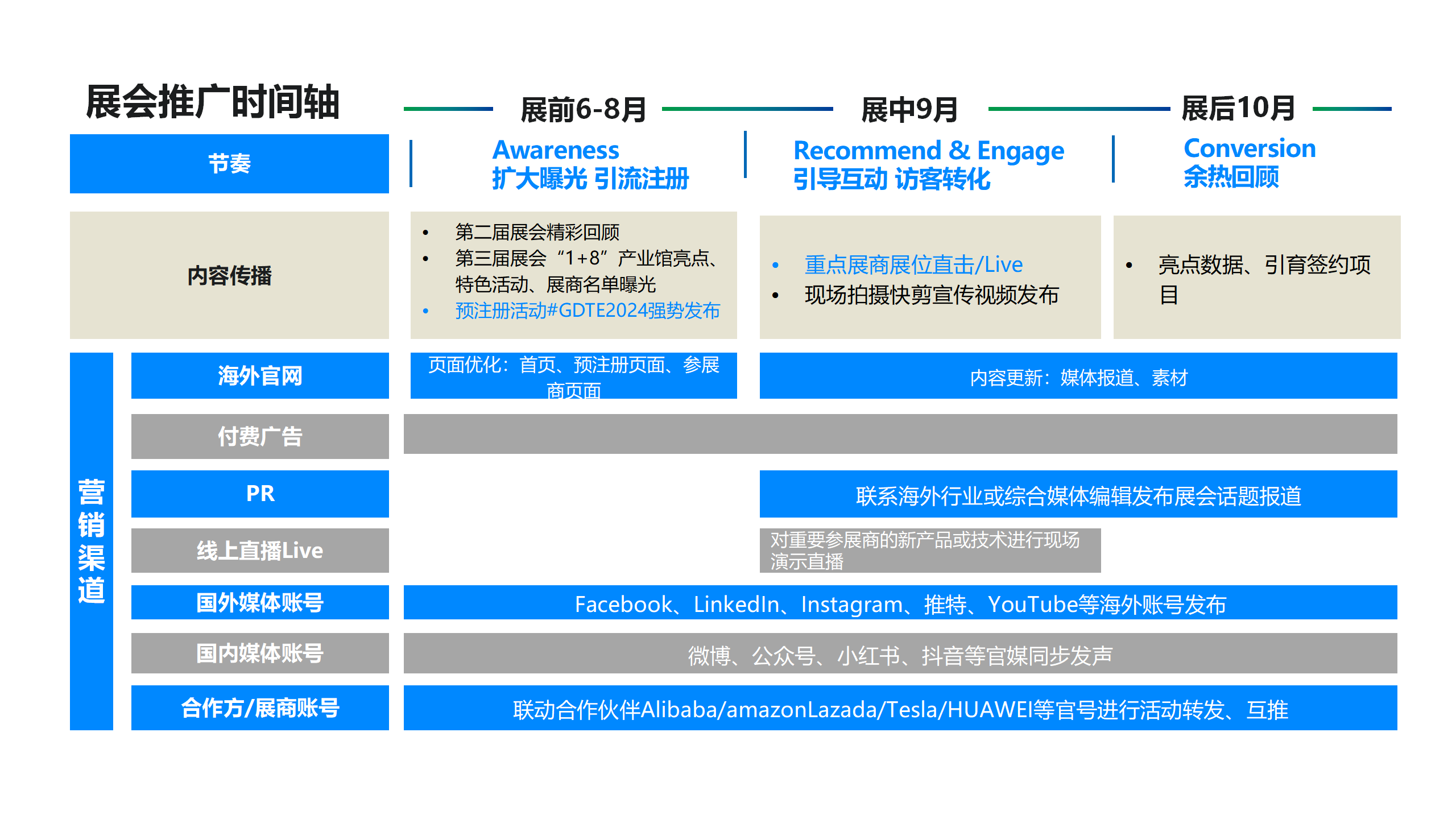 (2)竞争压力大:全球展会行业竞争激烈,且已有头部竞品(如CES)。数贸会的脱颖而出,面临较大竞争压力。(3)兼顾精准性和长效性的整合营销:如何精准定位传播人群,如何围绕短周期展会打造长周期宣发,如何实现品牌曝光、用户转化(注册)、口碑裂变的三重目标,均是较大挑战。