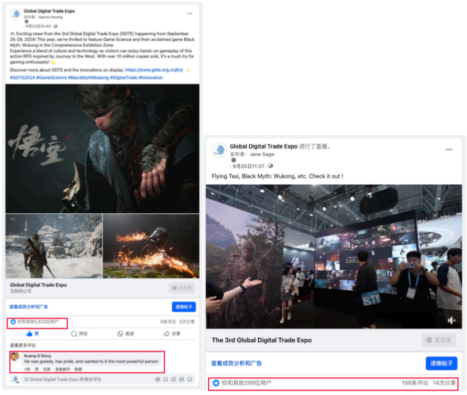 (2)传播信息差异化:与CES等展会相比,数贸会的独特性在于其结合了中国文化符号与科技实力,如借助“黑神话:悟空”国际热点话题和现象级IP,能够有效引发海外受众的兴趣和共鸣,降低跨文化传播门槛,提升数贸会的知名度和影响力。