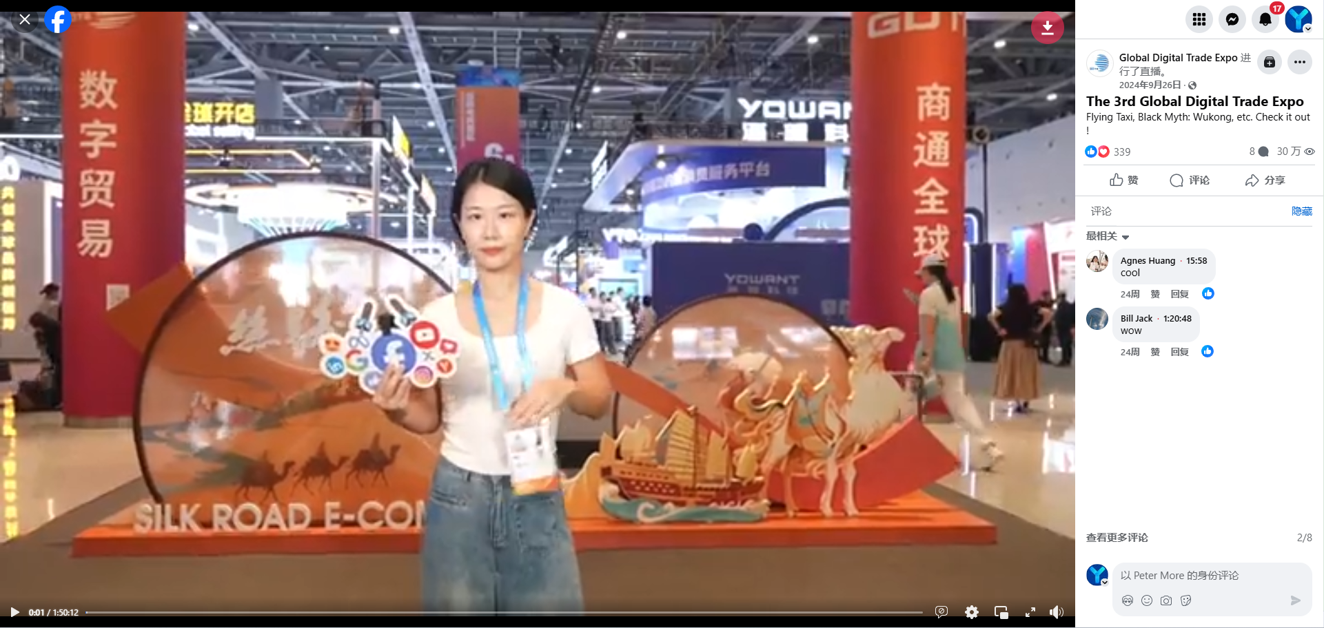 ③官方直播,云端观展:在数贸会官方Facebook账号进行直播,通过我们指定的主持人(前新东方老师)的跨文化能力和多语言能力,向全网实时传播。吸引流量并实现长效资产沉淀,延长展会生命周期,吸引持续关注。同时采用游动机位拍摄与多语言同传,制造“零距离逛展”的震撼感,如展区全景航拍、新产品特写镜头等,触发观众情绪峰值记忆。