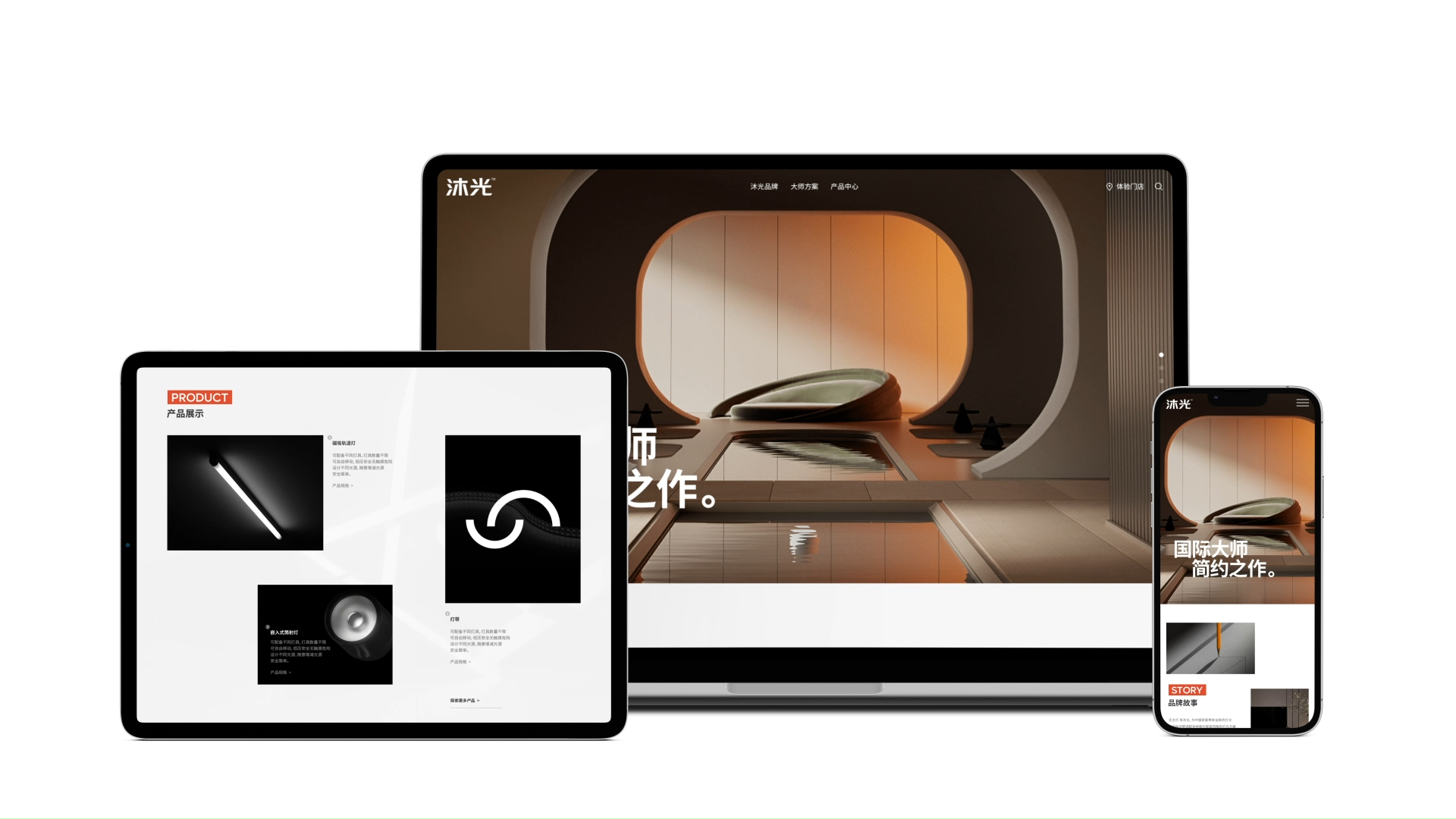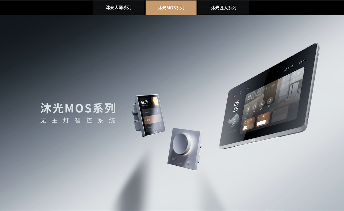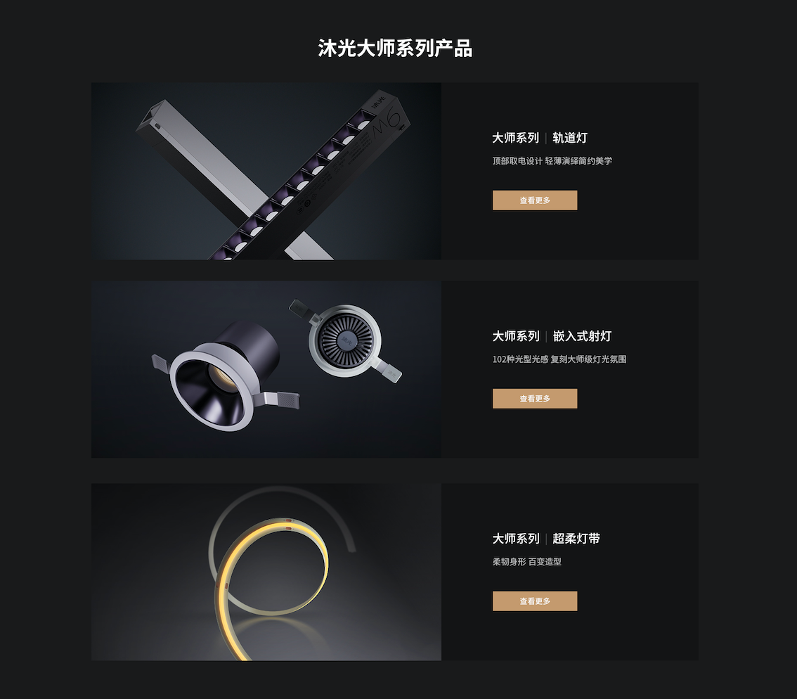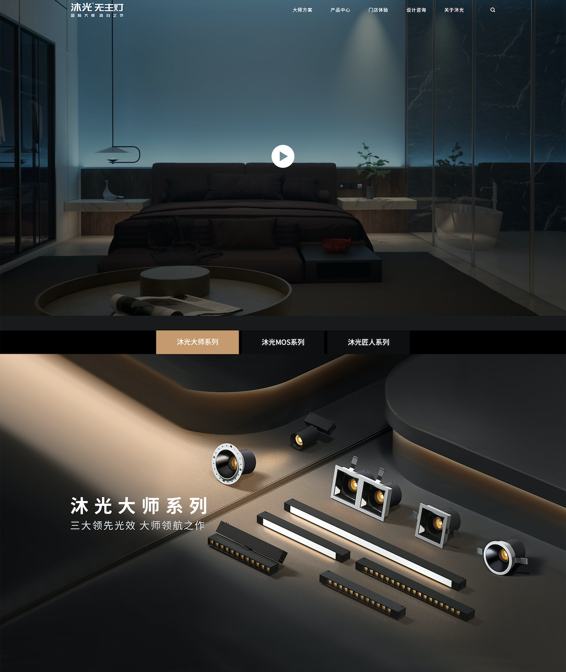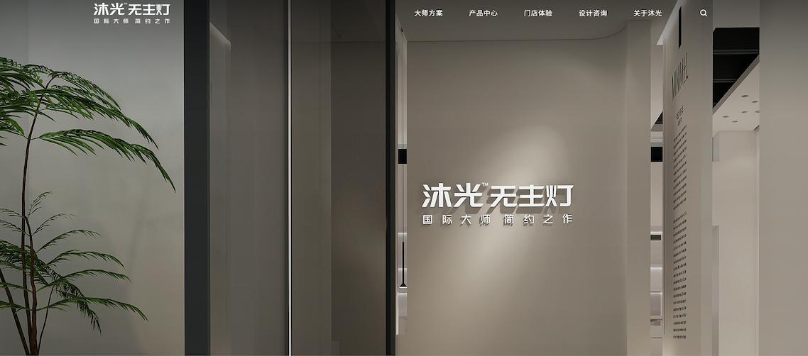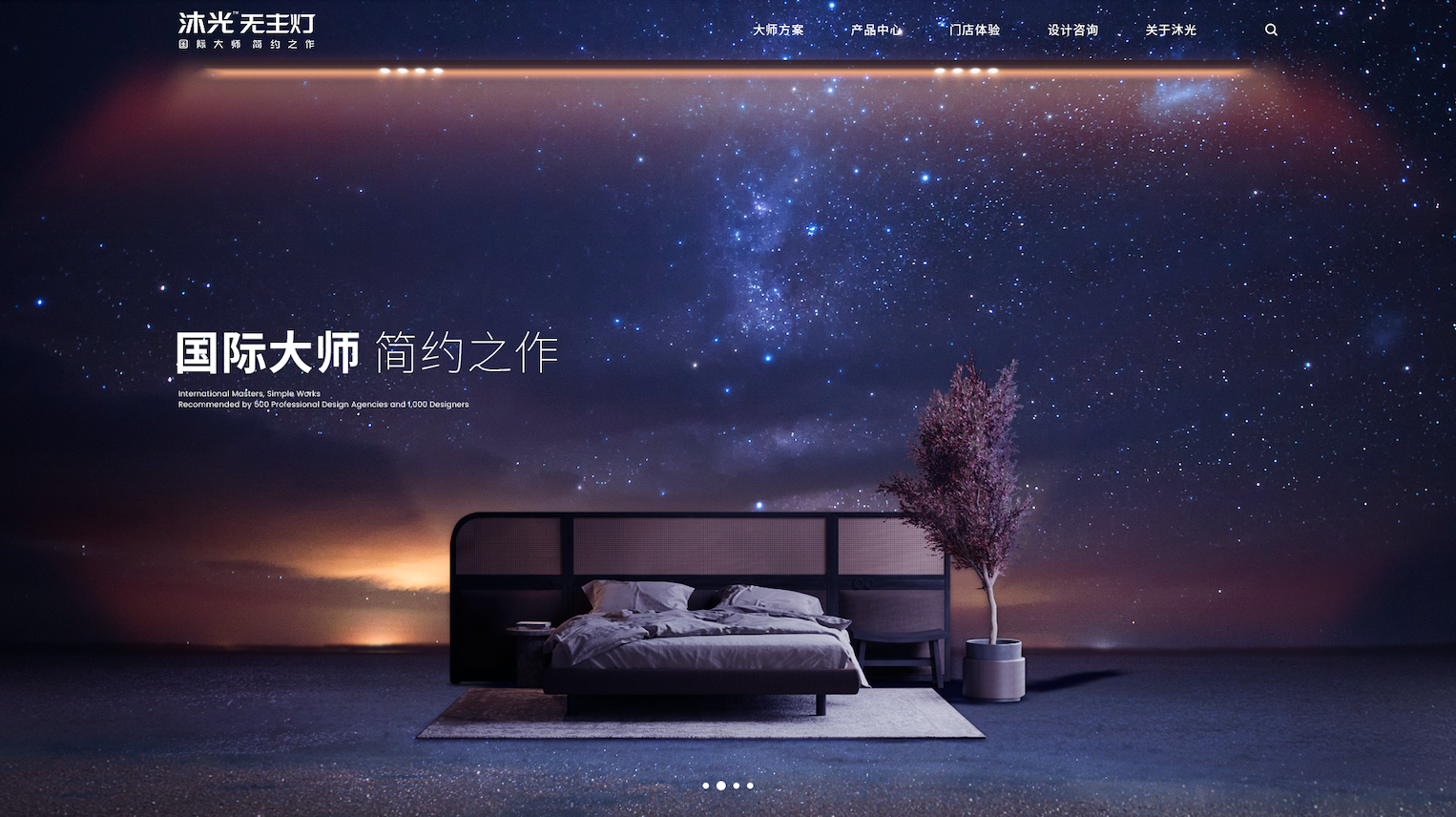 网站中,突出沐光无主灯与国际大师携手,独创更适配各式简约家装风格的全屋灯光方案,打造达到博物馆级光效,融入国际大师设计理念的重磅产品。以及品牌旗下的大师系列、匠人系列以及沐光MOS无主灯智控系统的核心优势。