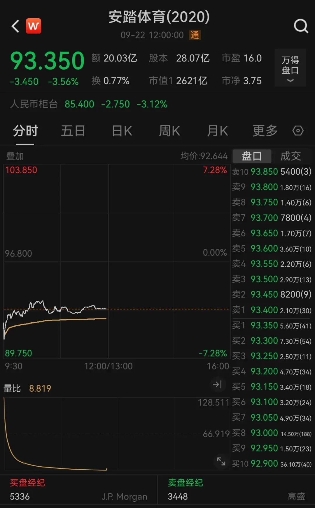 市场的反应冰冷而迅速。根据事件发酵后首个交易日的港股午间收盘数据显示,在当日恒生指数下跌0.99%、市场整体表现疲软的背景下,始祖鸟母公司安踏体育(2020.HK)的股价却大幅下跌了3.56%,市值蒸发超百亿港元。