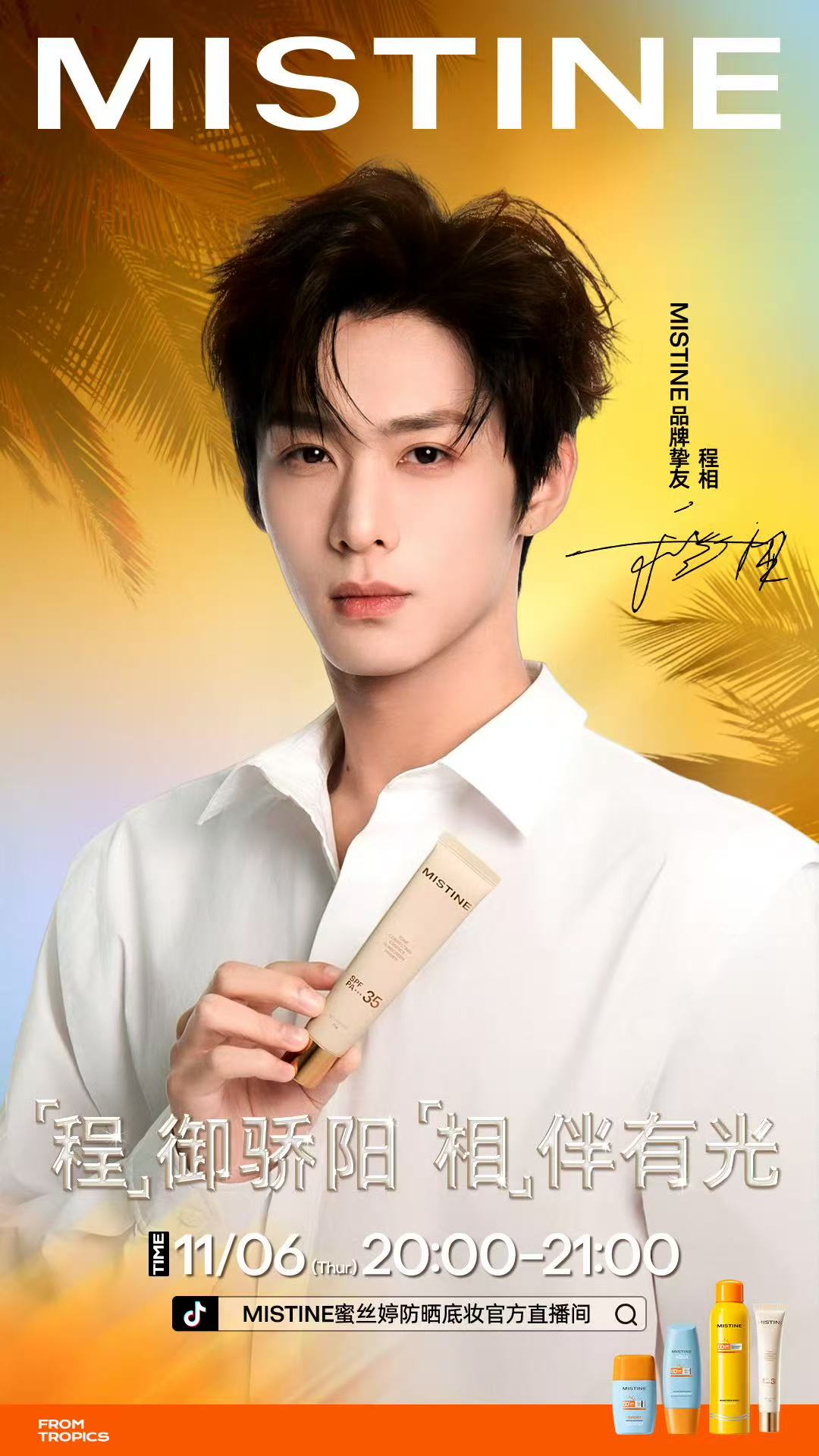 程相正式官宣成为MISTINE蜜丝婷防晒品牌挚友,双方围绕防晒及底妆产品展开合作。推出多款适配不同场景的防晒品,“高倍防护、轻薄成膜、干油皮专属”,通勤、户外、泳池等多场景需求都能满足。还联合发布“流光素颜霜”等,主打12小时持妆、伪素颜效果。11月6日20:00品牌直播间专场,程相亲荐产品并送亲签周边福利。