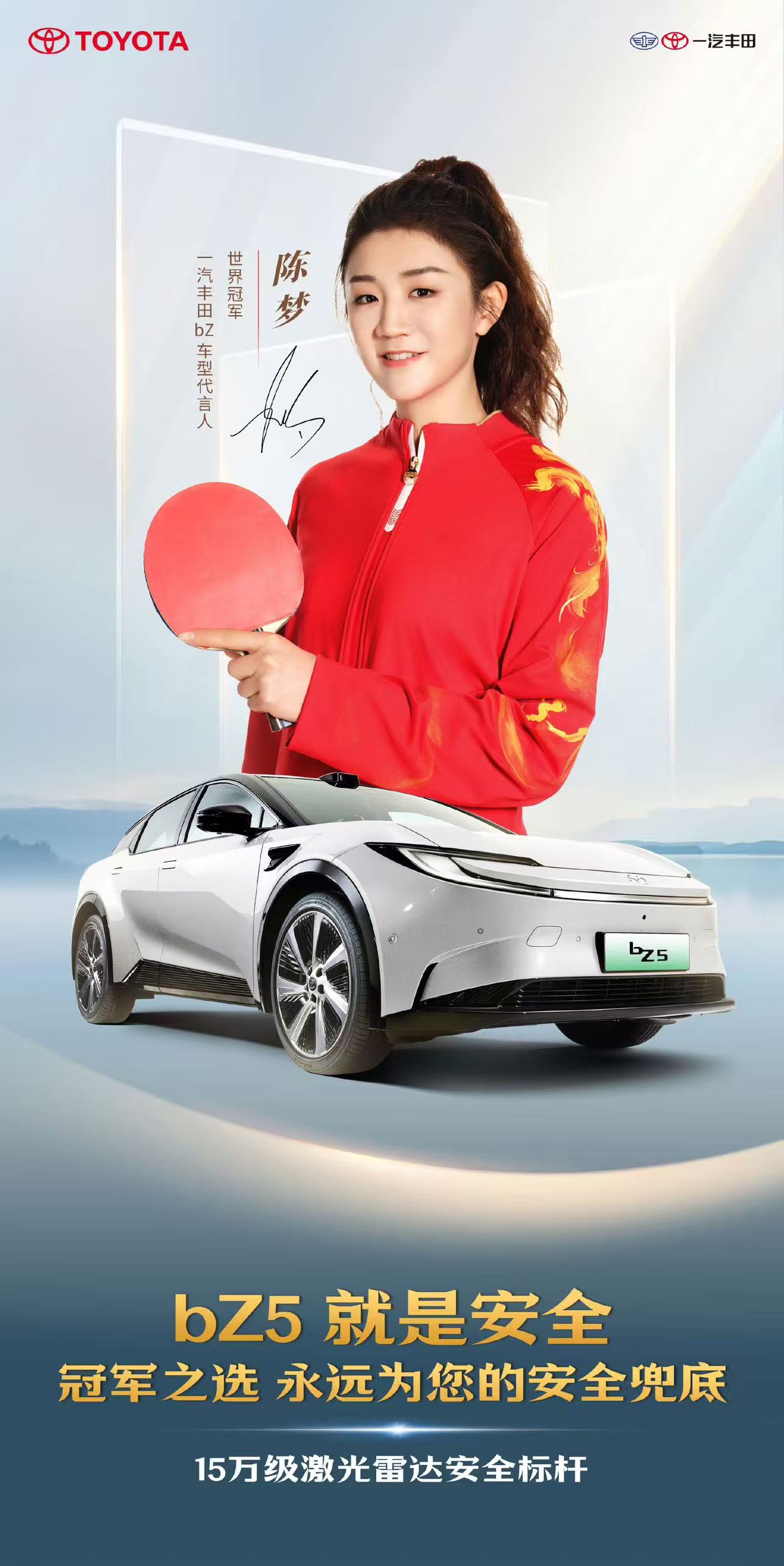 陈梦于2025年成为一汽丰田bZ5车型的产品体验官,并在后续升级为bZ系列代言人,参与品牌发布会并推广bZ5车型,重点突出其安全性与智能驾驶辅助功能。她以奥运冠军身份助力一汽丰田电动化车型的市场宣传,结合个人影响力推动“冠军品质就是安全”的品牌主张。