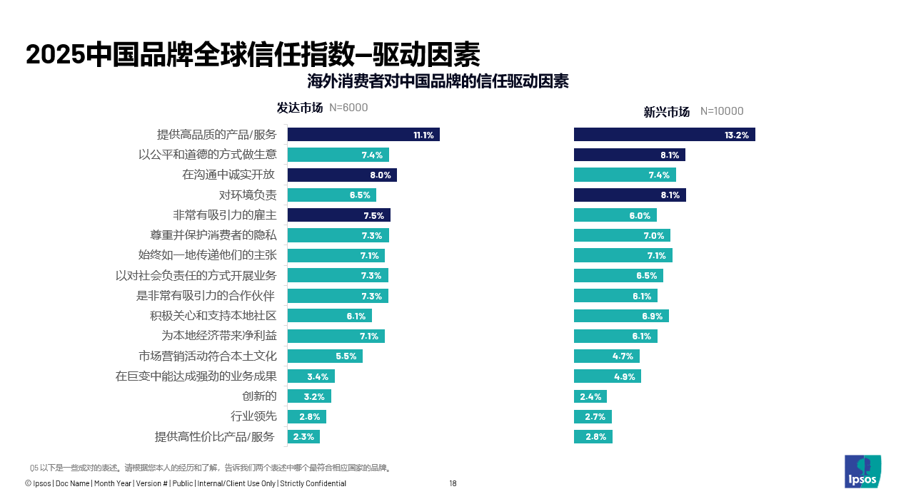 尽管「提供高品质的产品 / 服务」是全球消费者对中国品牌的共同核心诉求,但在发达市场与新兴市场中,各驱动因素的重要性占比仍存在显著差异。发达市场更注重关系型因素,“在沟通中诚实开放”和“非常有吸引力的雇主”跻身前三,反映出成熟市场消费者对品牌可持续发展能力的关注;新兴市场则更看重产品与环保维度,“以公平和道德的方式做生意”与“对环境负责”权重均达到8.1%,成为核心诉求点。