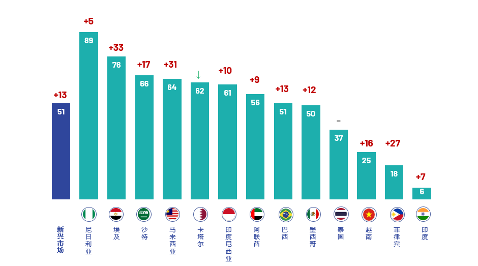 新兴市场持续成为中国品牌信任增长的强劲引擎。2025年中国品牌在新兴市场的净信任度高达51%,较2024年增长13个百分点,13个受访市场中有五个增长超15个百分点。非洲市场中尼日利亚(89%)、埃及(76%)的净信任度位居全球前列,中东市场沙特阿拉伯(66%)、阿联酋(56%)等均超过50%,南美市场巴西(51%)、墨西哥(50%)也实现双位数增长,形成了广泛的高信任市场矩阵。