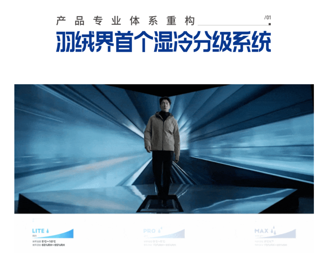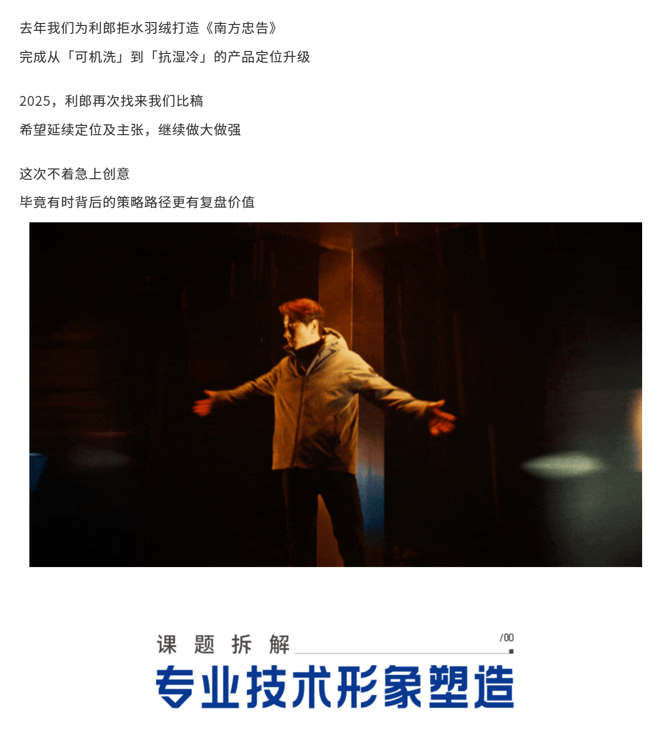 但或许是出于示范效应,过去一年,越来越多羽绒品牌开始进入湿冷赛道。作为拥有10000分钟拒水性能世界纪录的利郎,如何面对越来越多的竞品开始喊口号式蚕食「湿冷」公共标签,守住先手优势,这是我们比稿时就定义的课题。专业技术形象的塑造,便是本次的核心策略入口。