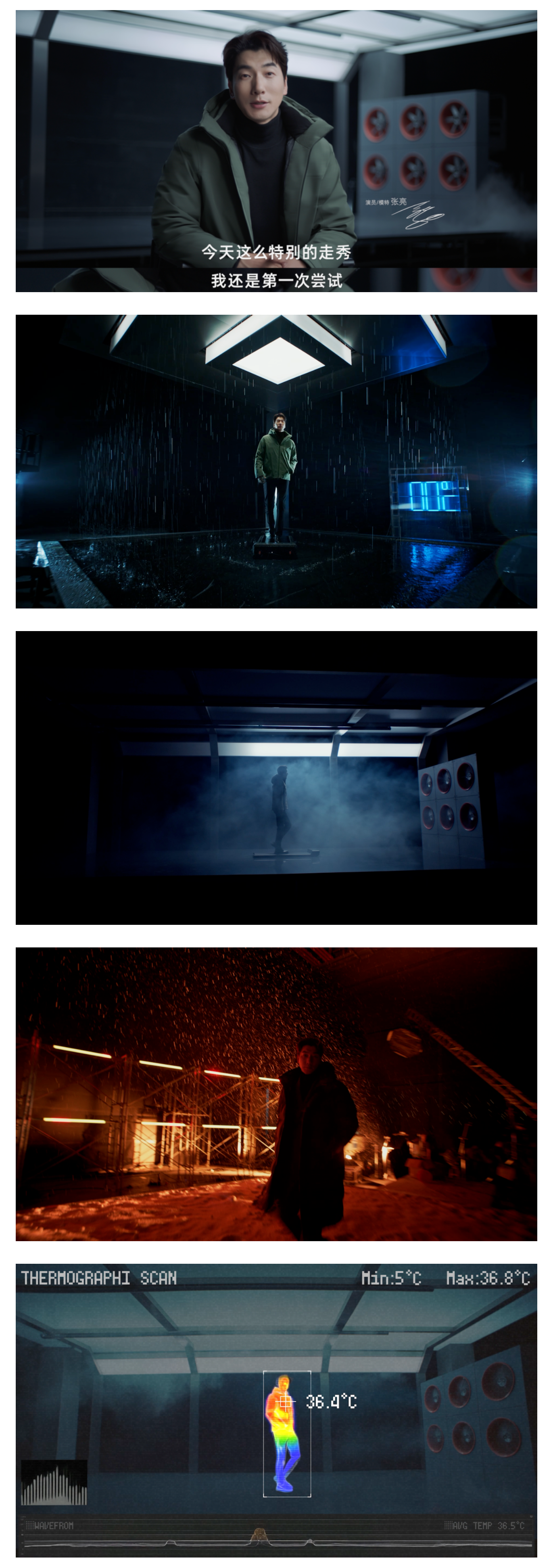 有别于话题型创意,这次我们核心围绕湿冷分级系统,认认真真传递产品专业性能,由此我们设计了一条特别的T台,邀请模特张亮,一起完成这场特别的走秀——通过模拟风雾、雨、雨夹雪等湿冷气候,展示拒水羽绒在不同湿冷等级下的拒水性能。