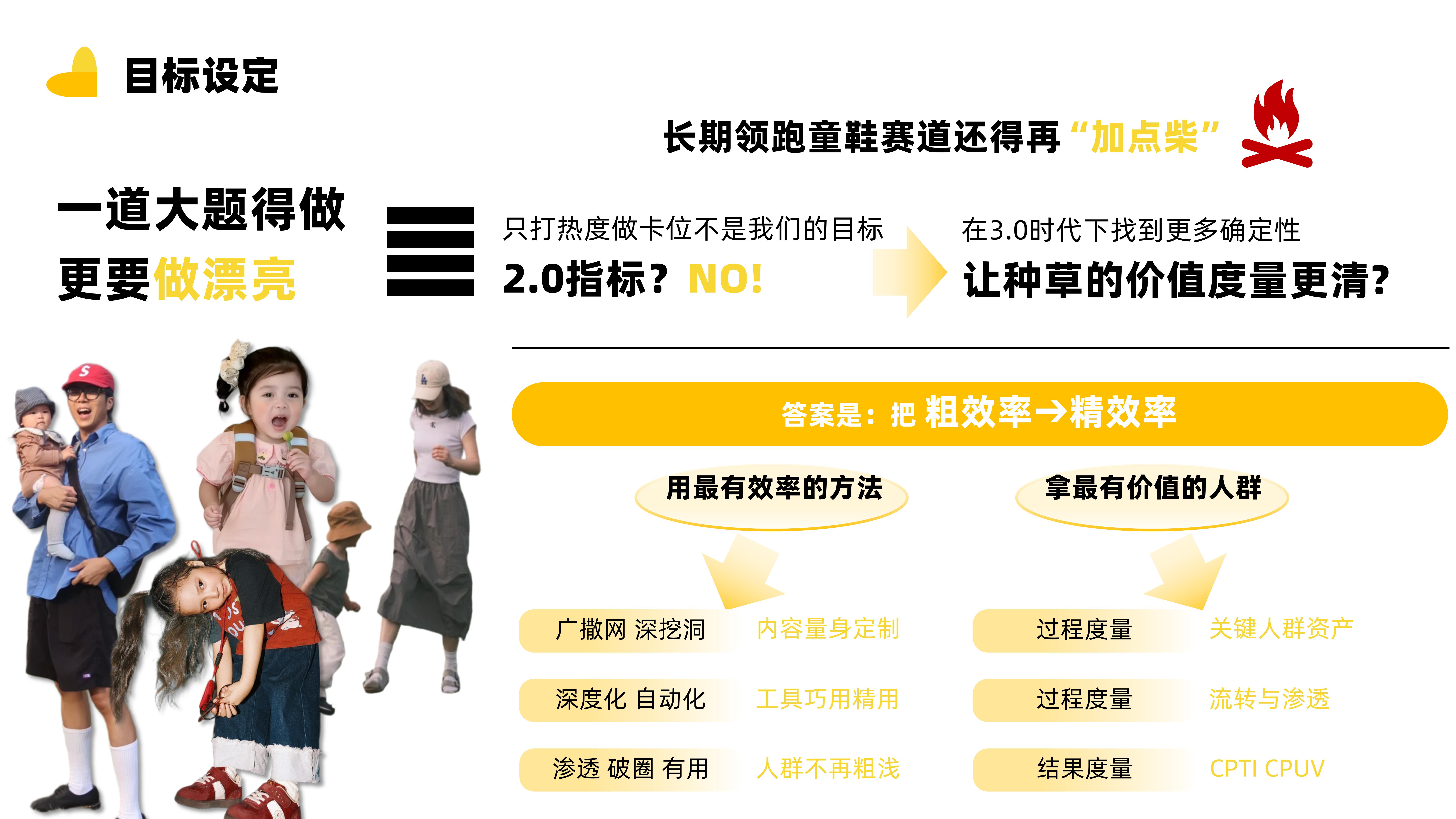 1. 质量转型:将衡量标准从“曝光量、阅读量”等粗效率指标,转向“CPTI(成本 per T+I人群)、人群流转与渗透率”等精效率指标,提升营销投入的确定性。
