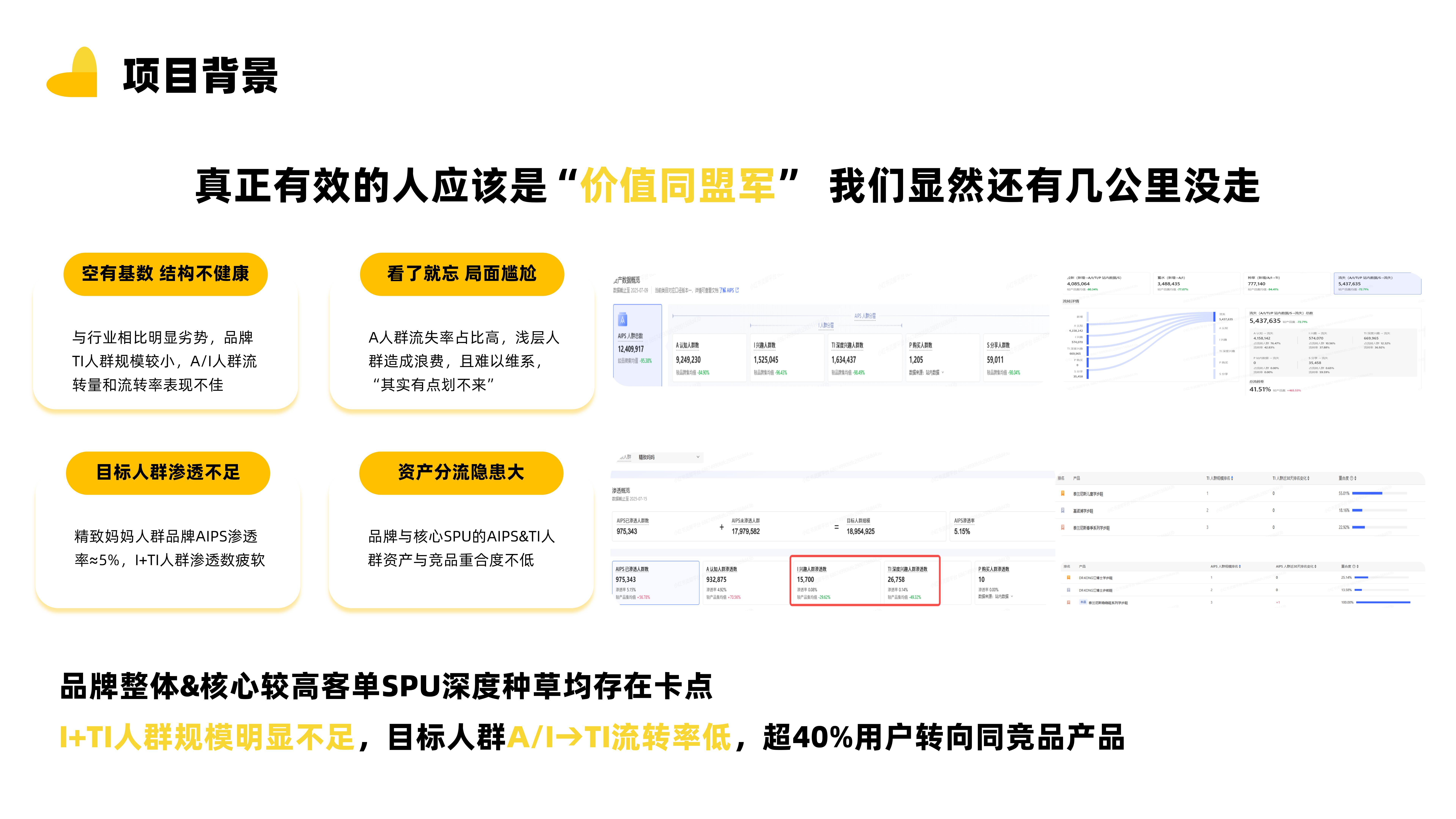 泰兰尼斯作为中国高端婴幼童鞋市场的领军品牌,年销售额突破30亿元,通过大规模的线下广告投放,已成为公认的“霸屏王”,拥有极高的品牌知名度。然而,在激烈的市场竞争中,品牌面临严峻的“失衡”挑战:尽管曝光量巨大,但线上品牌及核心产品的搜索排名波动大,用户“看了就忘”,难以形成深度认同和主动搜索。其营销投放呈现出“高热度、低转化”的困境,核心价值人群资产规模小、流转率低,且有大量用户流向客单价更低的国际竞品。
