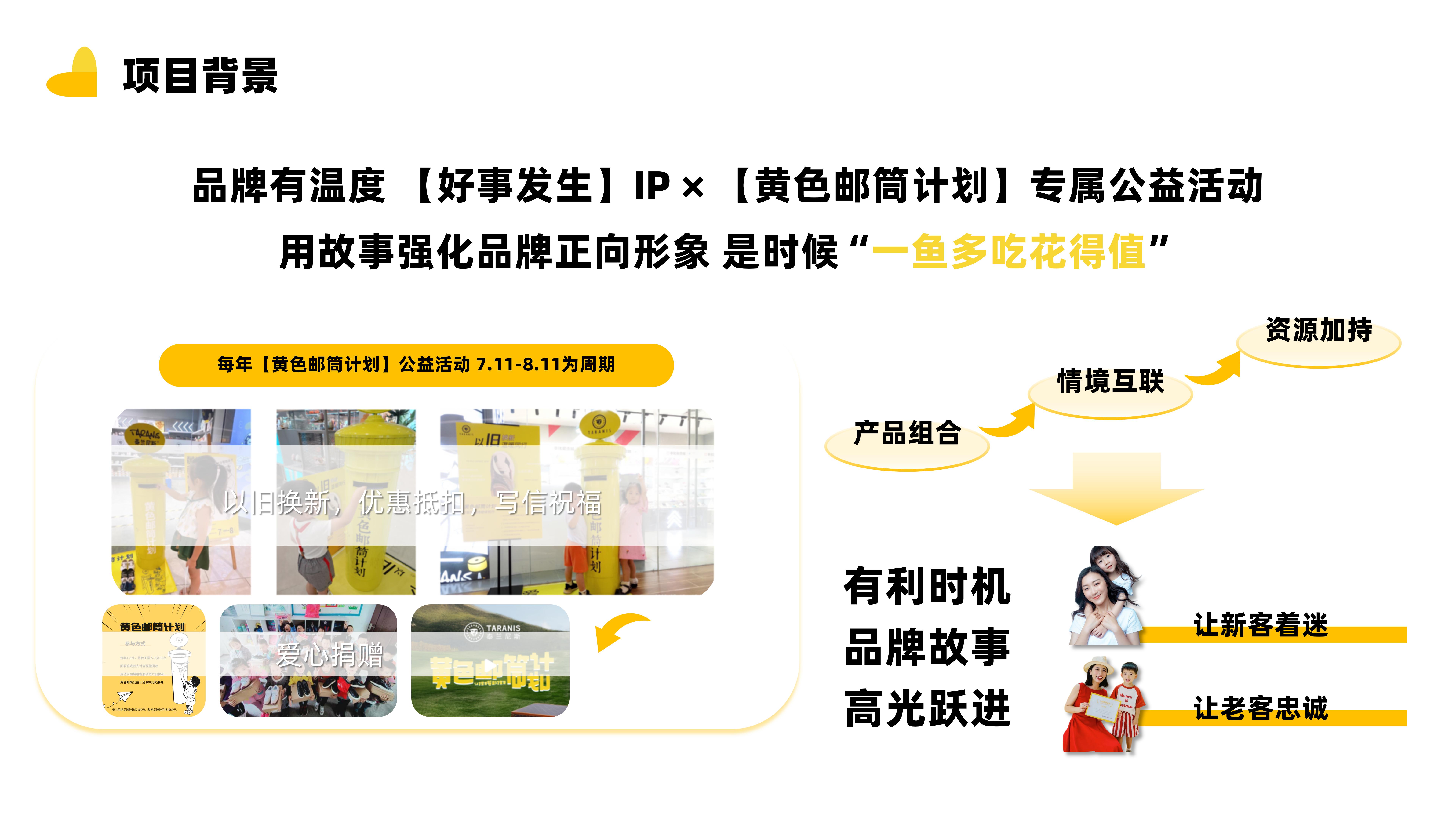 3. 价值深化: 借助“黄色邮筒计划”公益IP,将品牌温度转化为用户共鸣,讲好品牌故事,强化用户对品牌溢价的价值认同,有效防御竞品分流。