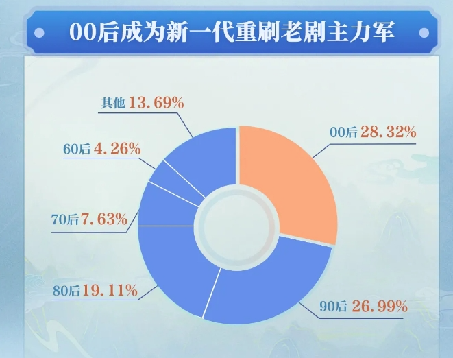 和以往经典剧观众以80后、90后为主的印象不同,《优酷经典剧观看报告》显示,在重刷经典剧的观众年龄分布上,00后达到28.32%,占比近三成,成为新一代重刷经典老剧的主力军。