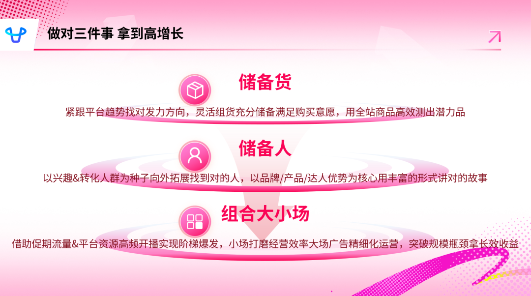 伴随平台发展,快手电商全域经营协同增长,2025年Q2多项数据飘红。为助商家抓住双11流量,《磁力金牛大促营销白皮书》发布。促前商家要紧跟趋势备货,用全站商品推广测潜力品;做好人群蓄水,通过人、故事、产品侧策略储备R3人群与粉丝。促中商家应组合大小场密集开播,小场打磨效率,大场发力经营与广告。借助磁力金牛产品,商家可更高效布局经营,抢占流量机遇,实现双11生意全域爆发。