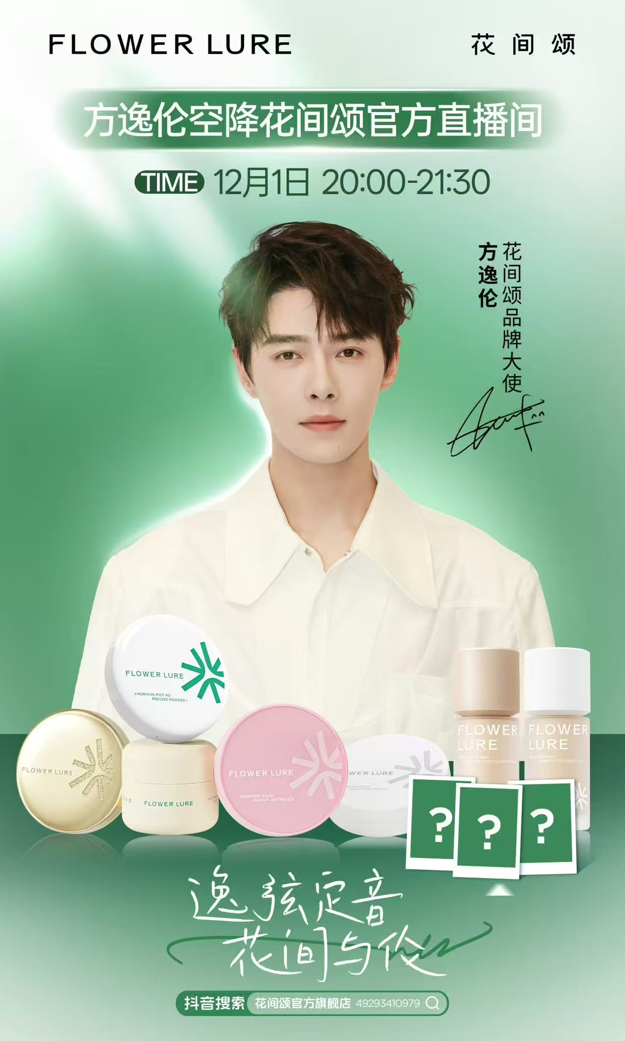 花间颂正式官宣方逸伦为品牌大使,双方于2025年12月1日携手开启“逸弦定音 花间与伦”主题直播活动,推出限定周边、亲签福利及专属产品套组。直播期间,方逸伦空降花间颂官方旗舰店直播间,带动销量突破300万元,并登顶抖音彩妆香水榜TOP1。品牌同步推出“方糖21天底妆打卡”活动,连续打卡可参与抽取方逸伦亲签照。多款联名产品如“贴贴霜”“经典粉饼”“气垫”等备受消费者青睐,且订单显示已进入密集发货阶段。