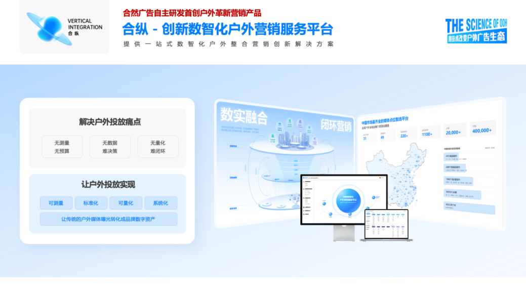 陈文静:【合纵】是合然旗下“S2B2B数智化户外营销服务平台”,基于合然10年+户外整合营销经验,沉淀户外全量媒介资源点位,融合多方数据,通过“数字资产管理-数智创新应用-智能订单交互-投放效果评估”等功能模块,解决了传统户外无测量无预算、无数据难决策、无量化难闭环的痛点,为品牌提供一站式户外整合营销解决方案,让户外投放实现可测量、标准化、可量化、系统化。自上线以来已赋能品牌累计200+个城市共120万+个媒介点位投放。
