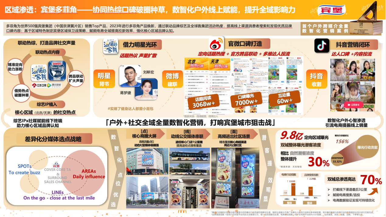 区域渗透的案例【宾堡多菲角】:首个应用数智化户外跨媒介场景组合的媒体优选以及全域数据的打通,以全量媒介为基础,渗透线下核心目标人群高浓度聚集场景,以“数智化测量+户外场景” 重焕渠道生机,突破品牌增长瓶颈。
