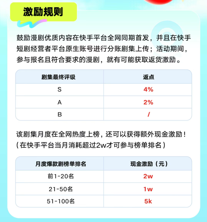 12月10日,为鼓励优质、多元、健康的漫剧内容生产,快手磁力引擎针对入驻快手端原生分账的漫剧机构制作方(PGC)和个人创作者(UGC)发布最新激励政策。快手漫剧分账业务正在高速增长期,释放大波自然流量,漫剧流量扶持更加一码,平台收入99%由合作方获得,PGC方面,针对在快手平台及全网同期首发的优质剧集,机构制作方将有机会获得最高4%的额外投流返点及2万元现金激励;UGC方面,以个人身份在快手短剧经营者平台原生账号进行新剧集上传,个人创作者就有机会获得最高1万元的现金激励。