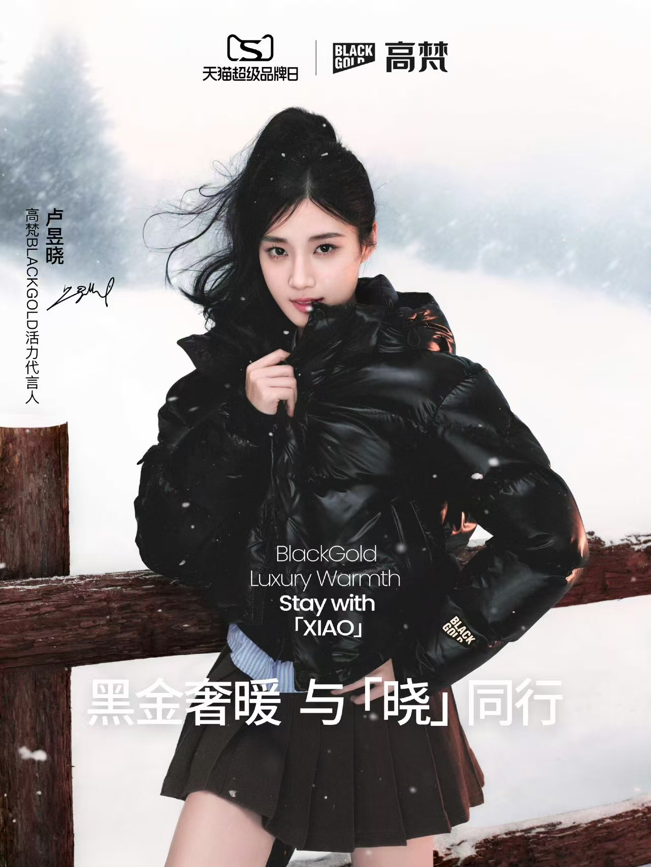 卢昱晓于2025年12月10日正式官宣成为高梵BLACKGOLD活力代言人,随后品牌在北大湖举办活动并开启直播推广,卢昱晓身穿黑金系列羽绒服参与滑雪场景体验,展示多款穿搭风格。其代言产品包括黑金泡芙系列、技能六格等主打轻盈无束缚感的奢华羽绒服,强调自由、温暖与时尚兼具的穿着理念。粉丝及官方账号同步发起晒单、支持话题,推动#卢昱晓高梵blackgold活力代言人#热度持续上升。