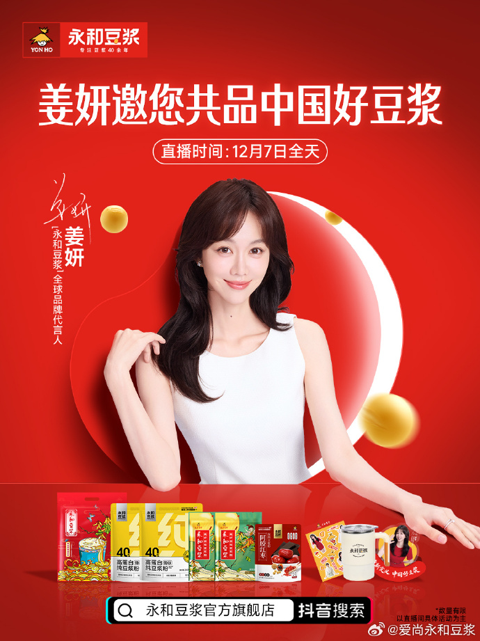 永和豆浆正式宣布演员姜妍担任其全球品牌代言人,双方携手传递“重新定义中国好豆浆”的品牌理念,强调“好原料、好配方、好营养”的匠心标准。此次合作聚焦健康养生方向,主推与“中华老药工0001号”传人喻文定联名研发的五色食养豆浆粉系列,涵盖黑方固肾、黄方益脾、红方养心、绿方疏肝、白方清肺等产品,融合药食同源理念与现代营养科学。姜妍以“温润亲和、厨艺精湛、注重养生”的公众形象与品牌高度契合,代言宣传中突出其“匠心生活家”特质,强化永和豆浆在东方食养文化中的角色定位。