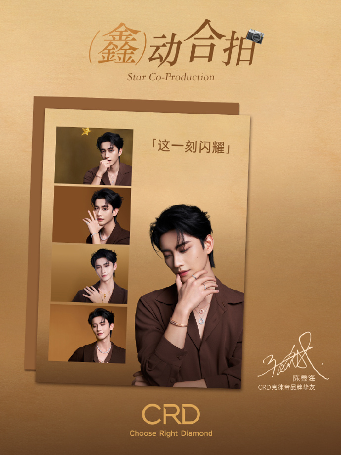 陈鑫海成为CRD克徕帝品牌挚友的合作于2025年12月10日正式官宣,双方以“Choose Right Diamond”为核心理念,共同传递“这一刻闪耀”的价值观,强调忠于自我选择的力量。品牌释放倒计时海报,以“捕捉『鑫』光”为线索引发期待。合作覆盖超30个城市核心商圈,如上海陆家嘴中心、杭州萧山万象汇等,投放陈鑫海主题广告,粉丝自发打卡并带话题分享。