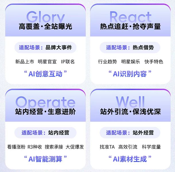 快手磁力引擎全新推出品牌广告G.R.O.W.增长策略,为品牌提供系统化经营框架。该策略涵盖四大核心场景:Glory(品牌大事件全域曝光)、React(AI赋能热点追投抢占声量)、Operate(站内深耕以GMV+X模式驱动涨粉、搜索与大促增长)以及Well(站外引流与科学度量)。策略全程深度融合AI能力,实现从投前易感人群挖掘、投中智能定向与创新样式提效,到投后外溢价值评估的全链路优化。同时,平台升级“品牌广告护航计划”,为CTR、R3资产、ROI等核心指标提供确定性保障,通过科学方法论与产品技术赋能,助力品牌在快手实现深度经营与确定性生意增长。