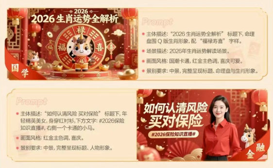 百度营销擎舵平台在2026年新春推出“春节不打烊”主题活动,利用AIGC技术助力企业抢占春节营销先机。平台核心提供两大AI创作服务:一是AI视频创作,包含能“一句话生成视频”的AI创编大师、焕新春节主题的AI模特形象以及丰富的行业视频模板,帮助快速制作拜年、促销等爆款内容;二是升级的AI图片创作功能,通过优化模型可实现用简洁提示词一键生成高质量、年味十足且文字精准的营销海报,并给出了多个行业的具体提示词范例。通过多模态生成能力,为企业提供开箱即用的新春解决方案,有效提升春节期间的营销效率和效果。