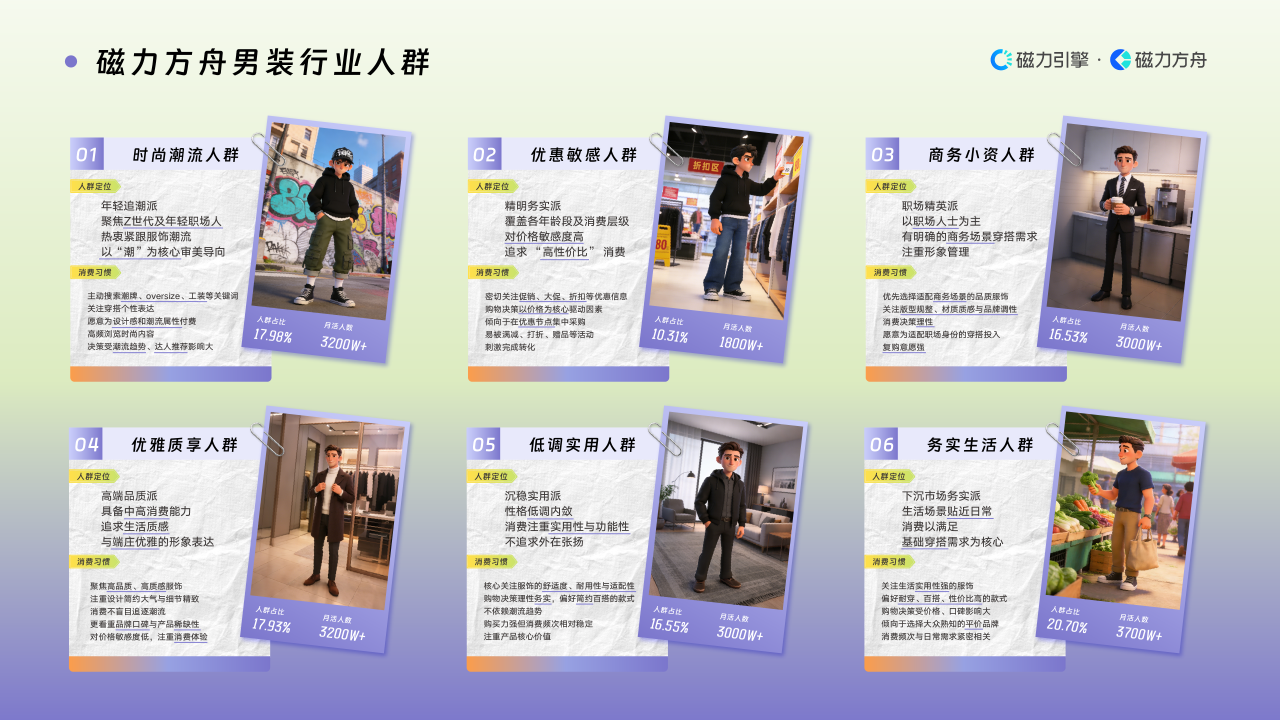 「男装运动行业人群种草」产品助力服饰品牌在复杂市场中精准锁定高潜客群,应对细分赛道多、库存压力大、投流利润薄等挑战。该产品基于快手内容与电商数据,通过科学模型划分运动户外十一大特色人群,覆盖专业赛事与大众休闲两大核心群体,精准识别用户种草心智与转化潜力;同时针对男装赛道定制六大画像,破解“直男审美”需求匹配难题。适用于所有入驻磁力方舟的服饰品牌,可在后台人群市场直接使用,实现高效种草与转化。